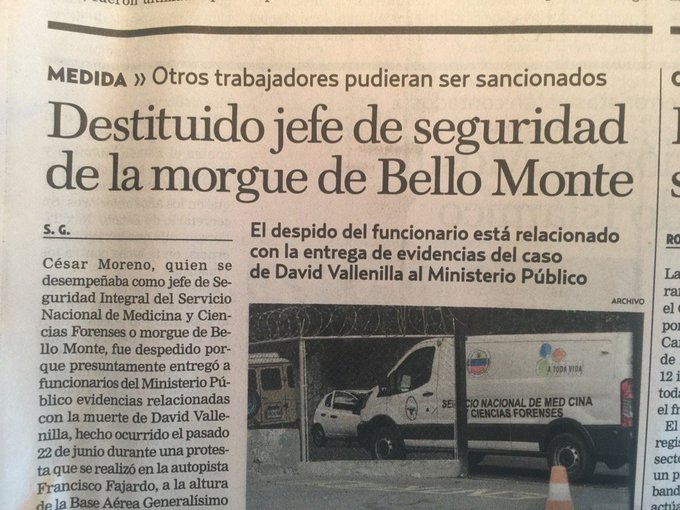 A través de las redes sociales @nelsonbocaranda publicó la nota de prensa del diario El Nacional, donde se explica sobre el despido a César Moreno, quien fue removido de su cargo el pasado 3 de julio y se desempeñaba como jefe de Seguridad de Medicina y Ciencias Forenses o Morgue de Bello Monte.